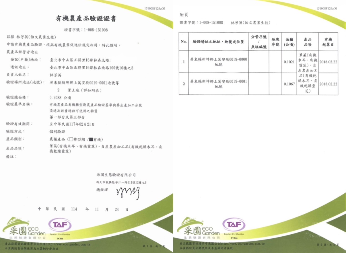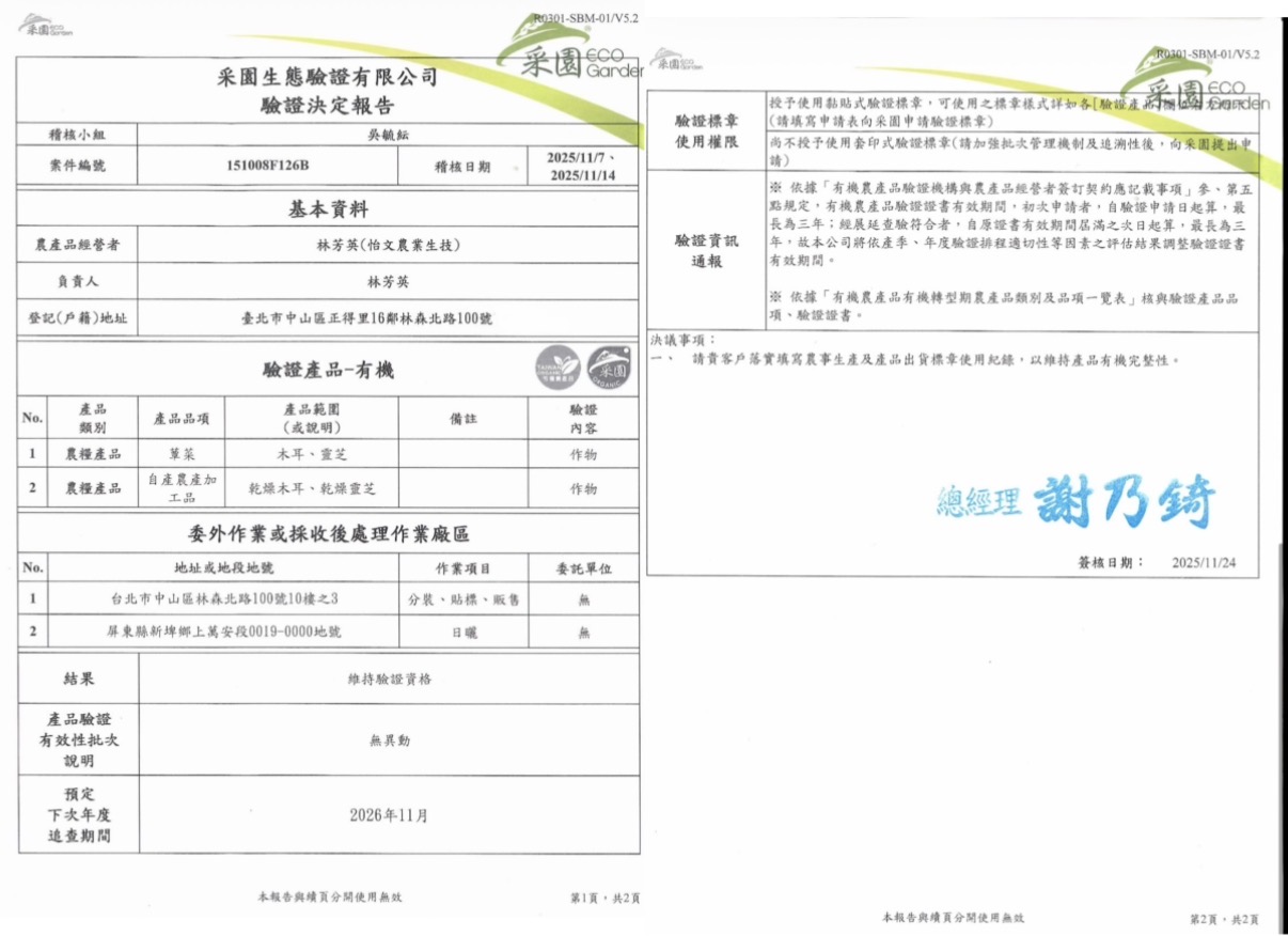 本產品通過采園生態認證有限公司有機認證及營養認證,且其有機認證資訊也獲得宜蘭大學有機中心資訊中心收錄。讓您食用送禮都安心,全素者可食。是您照顧家人健康的最佳選擇喔。
